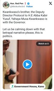 According to the tweet, Yahaya Musa Kwankwaso, Deputy Director of Protocol to Governor Yusuf and brother of former Kano State Governor Rabiu Kwankwaso, was seen accompanying the Governor. The post urged the public to “be calming down with that betrayal narrative please, this is politics,” highlighting the need for measured perspectives amid political speculation.